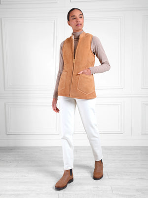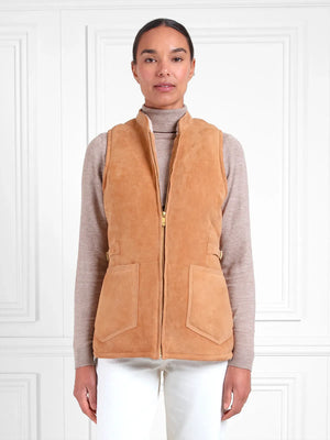 The definition of luxury layering, the Matilda Shearling Gilet blends wonderful warmth with a fabulous finish. The softest tan suede on the outside, with ecru lamb shearling on the inside, it promises rural style with a high-end look and feel. Fitted for a flattering line, with adjustable side buckle detail to create your perfect shape.