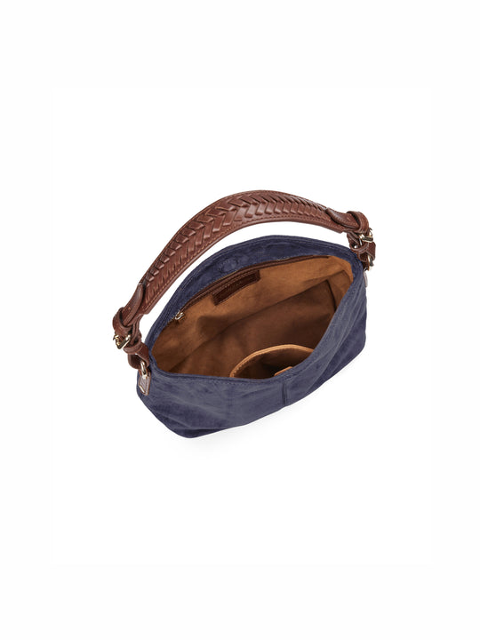 Handcrafted in soft, sustainably sourced suede with luxurious leather touches, like the braided over-shoulder handle and detachable crossbody strap, understated branding detail includes shiny light gold shield hardware and an embossed logo. The microfibre-lined large compartment, magnetic clasp fastening, internal zipped compartment and pocket, and a gold studded base complete the detail.