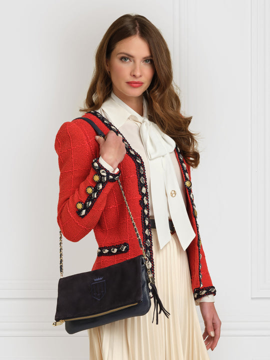 Our update of the original Finsbury in a roomy clutch bag design, finished with the same detachable gold chain and leather strap, our iconic tassel and tonal embroidered logo, so you know it’s Fairfax & Favor. Wear on your shoulder, as a crossbody bag or without the strap as a clutch bag for evenings.