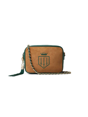 The Finsbury Crossbody Bag, compact yet spacious with a classic camera bag silhouette. Crafted in premium suede and leather, enhanced by the tonal shield embroidery and a detachable suede tassel. Designed with you in mind and sized to fit all your necessities, featuring a large internal compartment, internal pocket and a chevron back pocket. The Finsbury is a stylish option for when you’re on the go. Finished with a detachable gold chain and leather strap, can be worn over the shoulder or crossbody. Available in multiple colour ways, and sure to be a seasonal staple for years to come. Pair with your favourite jacket, Sennowe belt and Henley loafers for the ultimate weekend look.