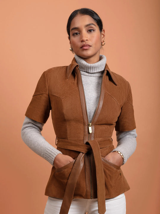 Say hello to our newest suede sensation. The Gina top is a versatile piece you can use to create an array of sophisticated spring and summer outfits. Zip it up with tailored pants and pair with ankle boots for weekend soirées, or wear it open over a favourite frock or your go-to top/jeans combo for casual coffee dates. For a flattering finish, tie the reversible belt and rejoice in its waist-enhancing powers.