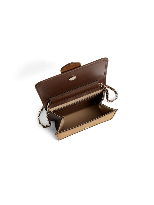 Evenings out never looked so elegant. Made for date nights and cocktails with the girls, the Mini Belmont is adorned with our all-new statement curved chevron hardware, a shiney light gold cutout guaranteed to catch the eye across the dancefloor. With its smart leather piping and sophisticated gold chain, the Mini Belmont looks at its best paired with a tailored dress and polished heels.