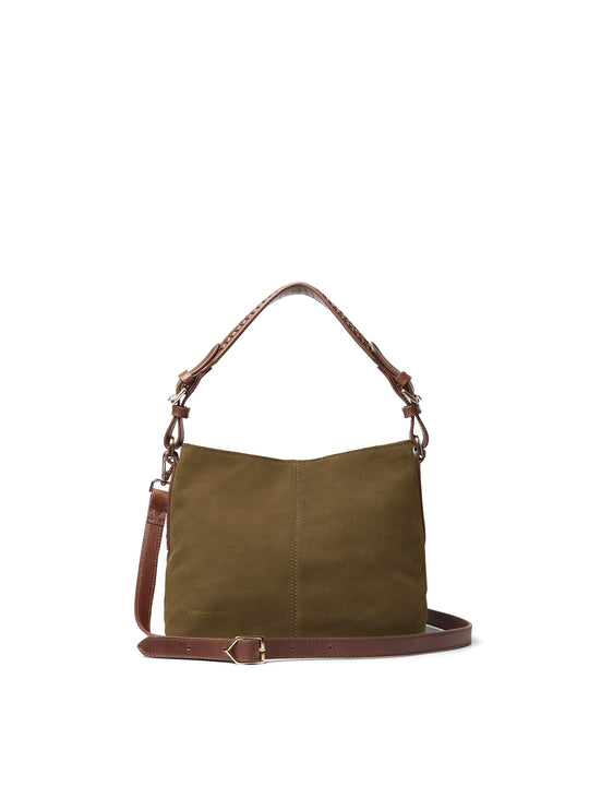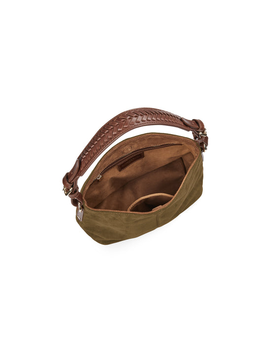 Handcrafted in soft, sustainable suede with luxurious leather touches, like the braided over-shoulder handle and detachable crossbody strap, understated branding detail includes shiny light gold shield hardware and an embossed logo. The microfibre-lined large compartment, magnetic clasp fastening, internal zipped compartment and pocket, and a gold studded base complete the detail.