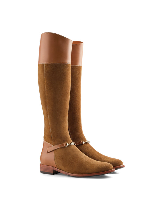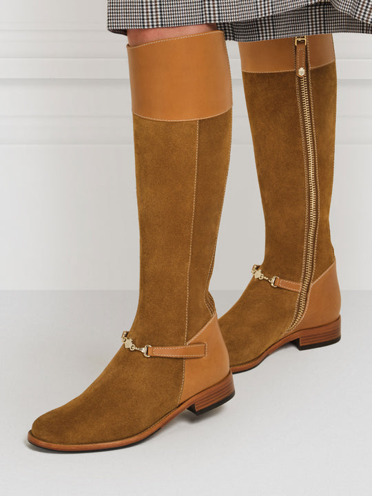 Update your smart or casual wardrobe with the elegant Octavia Flat Knee-High Boot. The low leather heel makes them wonderfully easy to wear, while our signature shiny light gold bit hardware adds the equestrian-inspired detail you love. A boot that fits the brief on so many occasions, adding polish to any look.