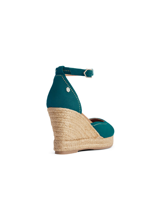 Ankle strap with signature chevron buckle: our signature belt buckle in mini form 9cm wedge heel: stand tall and strut your stuff Soft suede upper: feels a treat with bare feet Padded insole: walk the length of the beach in comfort Woven Jute and anti-slip branded rubber sole: the classic espadrille look Gold and navy shield hardware: unmistakably Fairfax & Favor