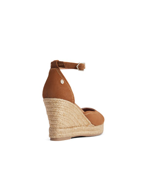 Ankle strap with signature chevron buckle: our signature belt buckle in mini form 3.5" wedge heel: stand tall and strut your stuff Soft suede upper: feels a treat with bare feet Padded insole: walk the length of the beach in comfort Woven Jute and anti-slip branded rubber sole: the classic espadrille look Gold and navy shield hardware: unmistakably Fairfax & Favor