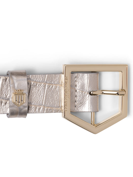 Handcrafted in Portugal, attention to detail includes a belt keeper with our signature gold shield hardware and a shiny light gold chevron buckle for the most sophisticated finishing touch,