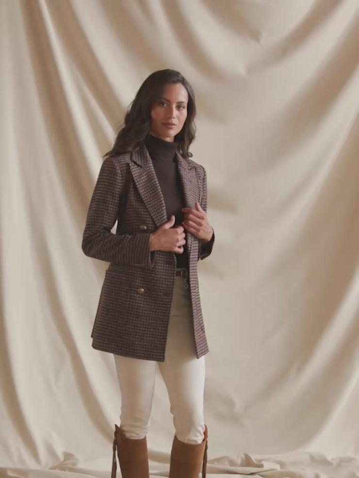 Beautifully cut from our plum check pure Merino wool fabric, the Clara Blazer blends superb quality with a warming, seasonal palette of colours. A country icon, with double breasted styling and a relaxed fit for effortless layering, we’ve finished the look with antique brass domed buttons on the front and cuffs for timeless style.