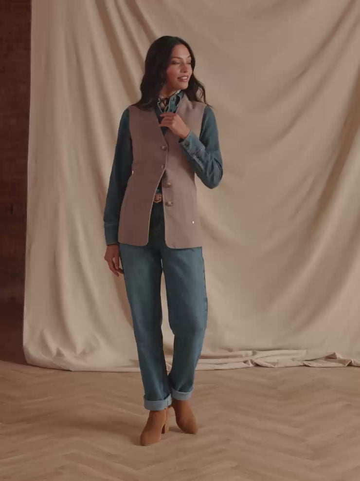A supremely smart transitional piece, the Eliza Gilet comes in a neutral shade that layers effortlessly over so many of your tops and knits.