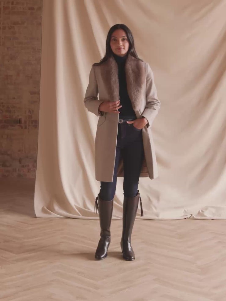 Expertly crafted in the UK from our premium pure wool fabric, the Harriet Coat offers elegance and quality in equal measures. With a sumptuous real Toscana shearling collar – detachable so you can choose your look – this coat is an investment piece, in a choice of timeless new season colours.
