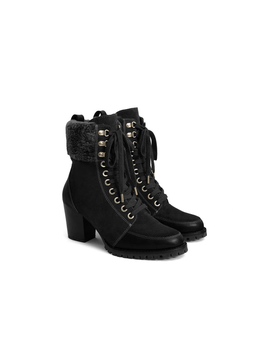 Military-inspired detail meets feminine styling in the Uxbridge Heeled Combat Boot. From the stacked 7cm heel to the luxe shearling cuff, it’s a dressier take on the Anglesey, made from premium, sustainably sourced nubuck with a tonal leather trim.