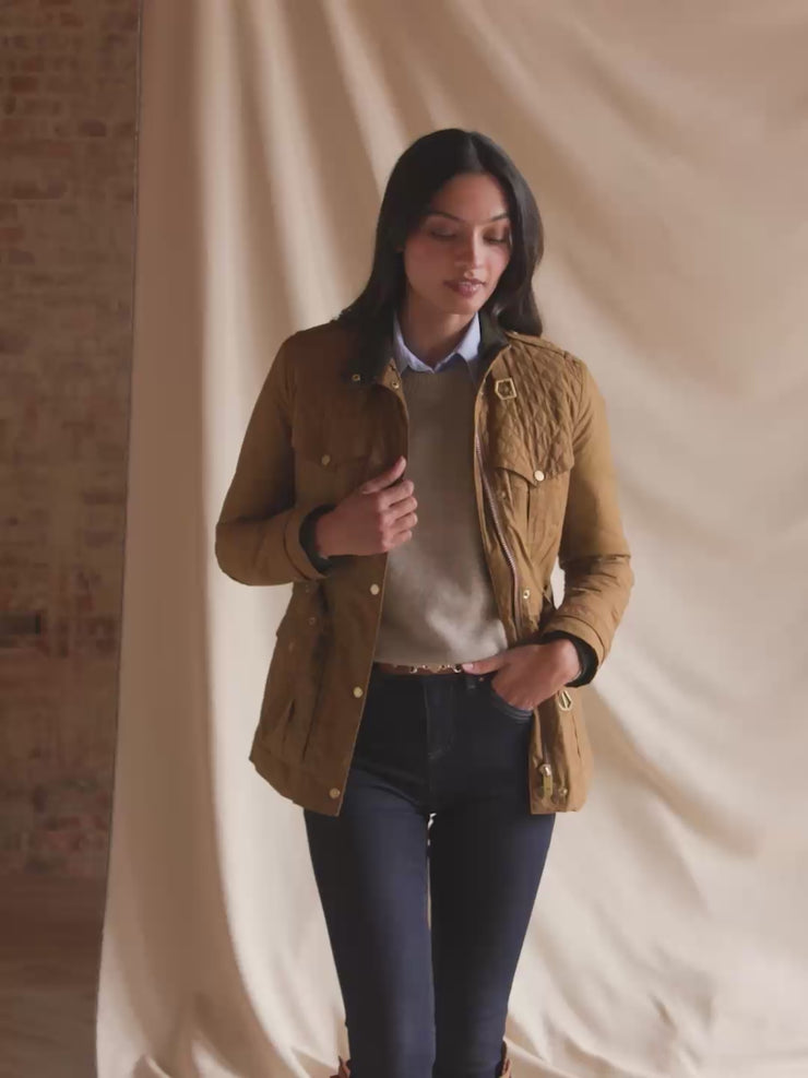 From quilted-look stitching, epaulettes and neck strap with chevron buckle to flat snap branded poppers and zip pull in our antique brass finish. A figure-flattering belt, double back vents, elasticated storm cuffs, soft-handle corduroy on the inside neck and an internal pocket complete the look.