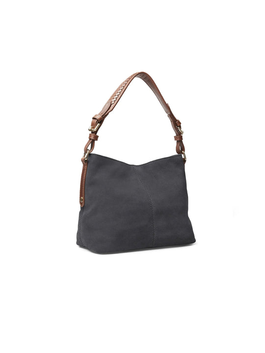 Handcrafted in soft, sustainably sourced suede with luxurious leather touches, like the braided over-shoulder handle and detachable crossbody strap, understated branding detail includes shiny light gold shield hardware and an embossed logo. The microfibre-lined large compartment, magnetic clasp fastening, internal zipped compartment and pocket, and a gold studded base complete the detail.