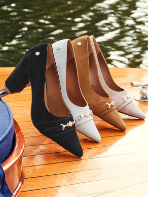 When you’re looking for a shoe that’s the definition of sophistication, the Chantilly Court Shoe is the answer. The elegant pointed toe shape and branded shiny light gold bit hardware are reminiscent of the Epsom, while we’ve given this design a modern 9cm suede-wrapped block heel, so it’s also effortless to walk on.