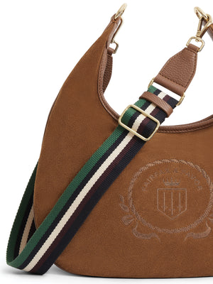 Level up your casual closet with the Richmond Hobo. This slouchy everyday essential has loads of room for all your stuff, with a big zip along the top to keep it all safe and sound. The adjustable green, navy, cream and plum webbing strap brings a pop of color to this suede sensation, with a stylish new incarnation of our logo adding the finishing touch across the front. Style your Richmond Hobo with jeans and a gilet or a floaty dress and ankle boots for relaxed weekends in town or country.