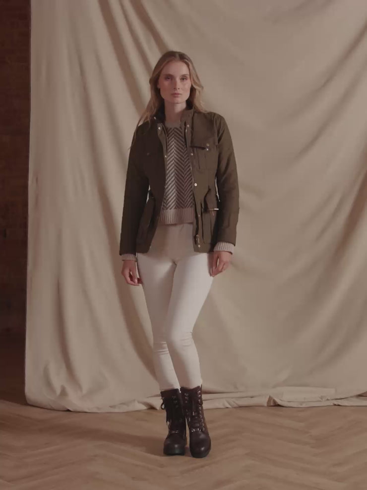 Beautifully tailored, and cinched at the waist with our iconic chevron belt, Sadie is our first ever wax cotton jacket - and the last word in country style. Crafted in a specialist breathable and water-resistant fabric, from the world’s leading manufacturer of waxed cotton, Halley Stevensons, this fitted, flattering and feminine style is finished with corduroy collar and sleeve details.