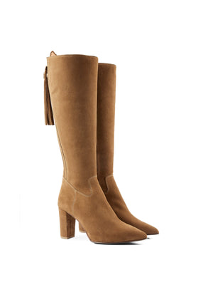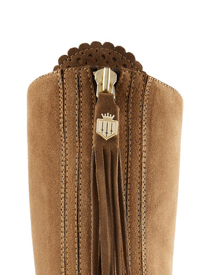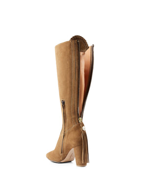 Individually handcrafted in Portugal from sustainably sourced suede, design details include a suede-wrapped 8.5cm block heel, shiny light gold hardware, a scalloped fan and an iconic Fairfax & Favor tassel – interchangeable to complement your outfit. A fully leather-lined interior, padded insole and elasticated stretch panels ensure comfort and a great fit, while the ankle-length inner zip and full length back zip – both premium YKK quality – make it effortless to get on and off.